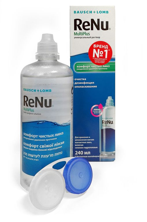 Универсальный раствор ReNu® MultiPlus предназначен для ежедневной очистки, удаления протеиновых отложений, промывки, химической (не термической) дезинфекции и хранения мягких (гидрофильных) контактных линз.