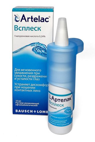 Артелак Всплеск - препарат искусственной слезы, содержащий гиалуроновую кислоту в высокой концентрации, который способствует быстрому устранению симптомов сухости и дискомфорта глаз.